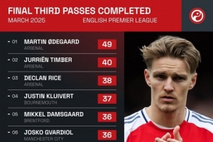 英超3月进攻三区成功传球排名:厄德高49次居首,阿森纳包揽前三